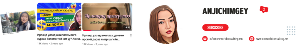 Миний бие Ирландад гэр бүлээрээ амьдарч, тухайн улсын визний бодлого, амьдралын орчин, бодит боломж ба хязгаарлалтыг дотроос нь мэдэрч байсан. Үүнийгээ амьдарч байх хугацаандаа YouTube дээр влог хийж хуваалцаж байсан. Ямар боломжууд байдаг тухай дэлгэрэнгүй мэдэхийг хүсвэл Анжигийн AnjiChimgey YouTube хуудсаар энд дарж зочлоорой.